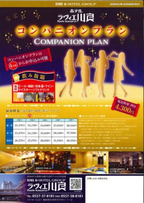 | 館内施設 | ロビー、ラウンジ「カフェド・リヴィエール」、ラーメン・居酒屋「馳走屋」、レストラン・カラオケバー「セブンスヘブン」、カラオケ・パーティルーム、卓球室、ゲームコーナー、コンベンションホール・会議室・宴会場、インターネット接続ブース、売店、駐車場 |